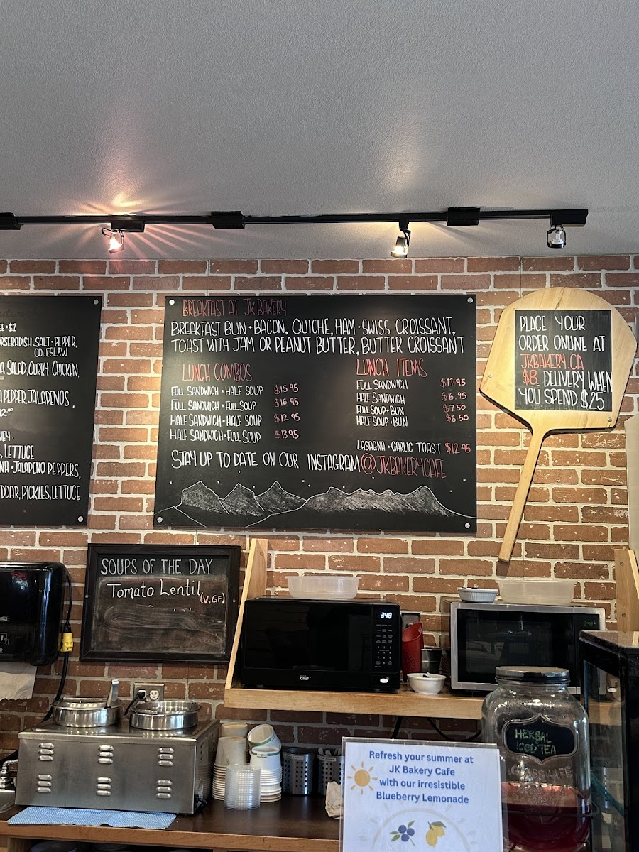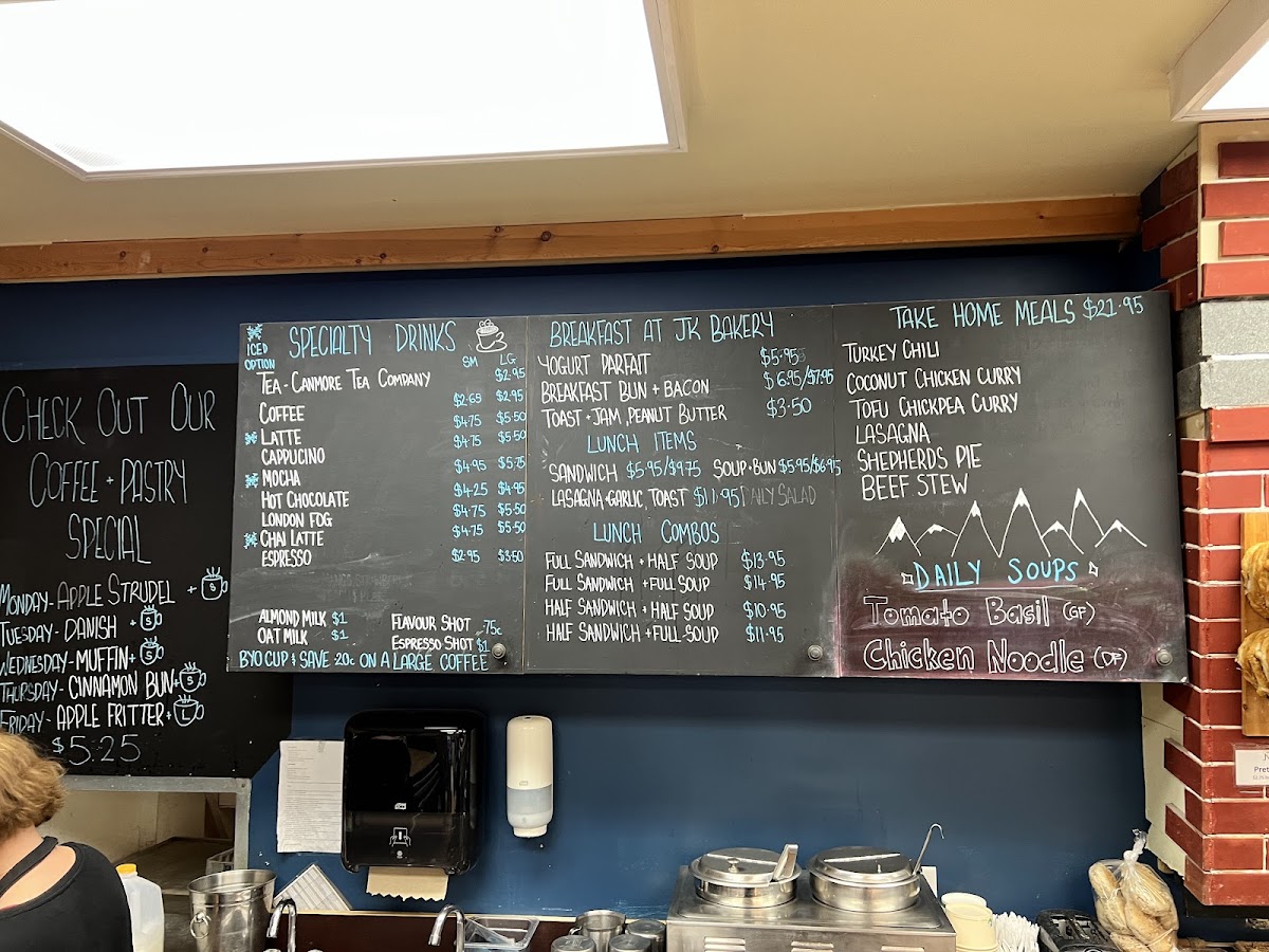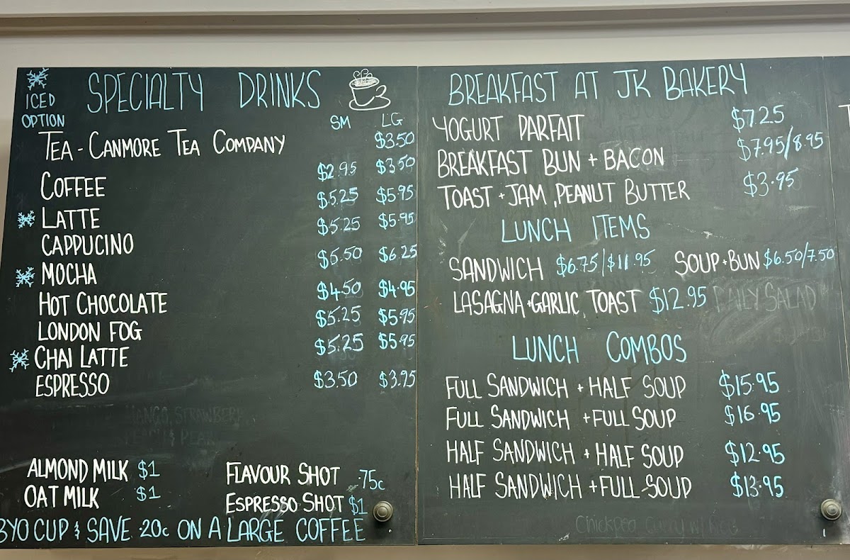 The menu at JK Bakery Cafe offers a delightful range of options for any time of the day, with a focus on fresh ingredients and comforting flavors. For specialty drinks, they feature options like Tea - Canmore Tea Company, Coffee, Latte, Cappuccino, and Mocha, providing a warm selection to pair with any meal. If you're stopping by for breakfast, the cafe serves a variety of simple yet satisfying choices, including the Yogurt Parfait, Breakfast Bun + Bacon, Toast + Jam, and Peanut Butter. For lunch, you can enjoy a variety of combo options, such as the Full Sandwich + Half Soup, Full Sandwich + Full Soup, or Half Sandwich + Half Soup. The standalone lunch items include hearty choices like a Sandwich, Soup + Bun, Lasagna, Garlic Toast, and a Daily Salad. Each dish is thoughtfully prepared, with something to please every palate, whether you’re in the mood for a light snack or a more filling meal. The prices are not listed, but the range of options ensures there's something for every craving.
